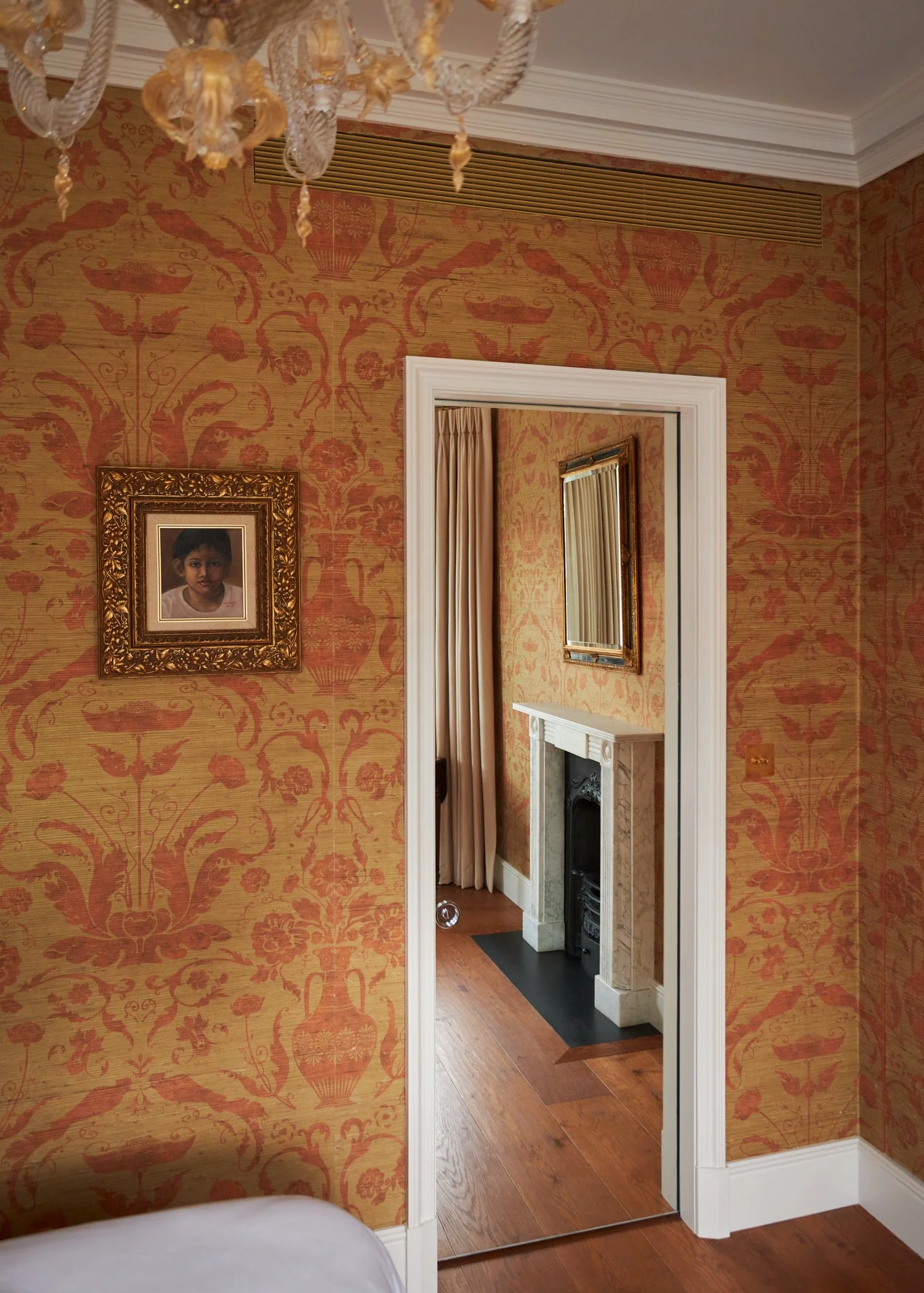 The brief for this project was to create new or use existing wallpaper designs that would match the house's colour pallet and complement its Georgian style. We decided to go for a warm, textured damask style repeat in the guest bedroom. A bold, large scale pattern printed on the grasscloth transformed this space into a luxurious, relaxing retreat.