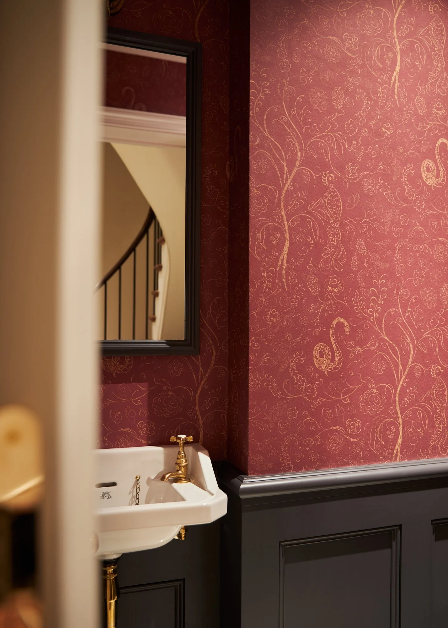 Gorgeous Snake pattern in classic burgundy was a perfect match for the powder room on the ground floor. This design was inspired by Edgar Brandt "Cobra" wall lamp used in this powder room